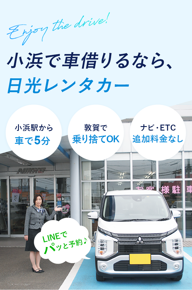 人魚の浜などの海水浴場や、蘇洞門めぐりの遊覧船、歴史深い三丁町などナビゲーションシステム搭載のレンタカーで安心・安全に小浜巡り♫